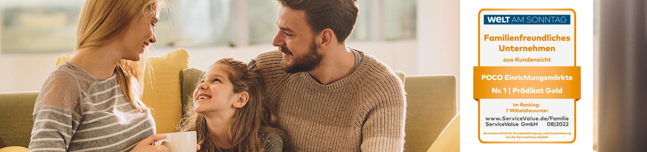 Familien mit Kindern haben beim Einkauf oft besondere Bedürfnisse, die erfüllt werden wollen. So sollte das Umfeld familiengerecht aufgebaut sein und eine kinderfreundliche Atmosphäre herrschen, in der sich alle Mitglieder während des Shoppens wohlfühlen. POCO gelingt dies außerordentlich gut, sodass der Möbeldiscounter zum zweiten Mal mit dem Prädikat Gold als „Familienfreundliches Unternehmen“ ausgezeichnet wird.
