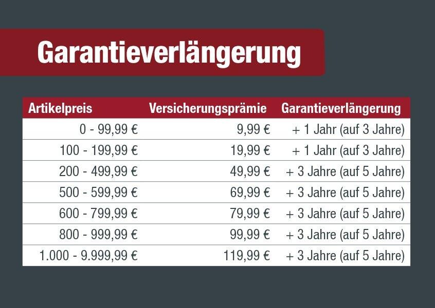 Schnelles, unbürokratisches Vorgehen im Schadensfall durch ein geschultes Service-Team und ein bundesweites qualitätsgeprüftes Reparaturnetzwerk. Mit der Garantieverlängerung für Elektrogroß- und TV-Geräte* können Sie Ihre finanziellen Reserven für schöne Dinge verwenden und müssen nicht mehr an unerwartete Reparaturkosten denken. * Versicherungsdauer zusätzliche drei Jahre zur Gewährleistung/Herstellergarantie; Die Garantieverlängerung beginnt nach Ablauf der Gewährleistung/Herstellergarantie. Ausgeschlossen sind Schäden, die unter die Gewährleistungspflicht des Herstellers oder Händlers fallen sowie äussere Beschädigung. Produktgeber und Versicherer ist die Helvetia Global Solutions Ltd, Aeulestraße 60, LI-9490 Vaduz.**Garantieverlängerung auf fünf Jahre ; Die Garantieverlängerung beginnt nach Ablauf der Gewährleistung/Herstellergarantie. Versichert ist der plötzliche und unvorhergesehene Verlust der Funktionsfähigkeit des versicherten Gegenstandes als Folge von Konstruktions-, Material-, Fabrikationsfehlern (analog der Hersteller- oder Verkäufergewährleistung) . Im Schadenfall ist die versicherte Person von der Zahlung eines Selbstbehalts befreit. Produktgeber und Versicherer ist die Helvetia Global Solutions Ltd, Aeulestraße 60, LI-9490 Vaduz.
