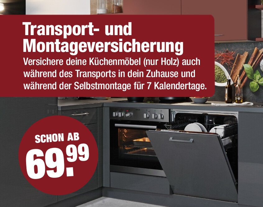 Mit der Transport- und Montageversicherung für Küchenmöbel sind Deine Küchenmöbel gegen Beschädigung* oder Zerstörung* geschützt, die durch eine plötzliche und unvorhersehbare äußere Einwirkung während Transport oder Montage entstehen können (z. B. Sturz eines Möbelteils).