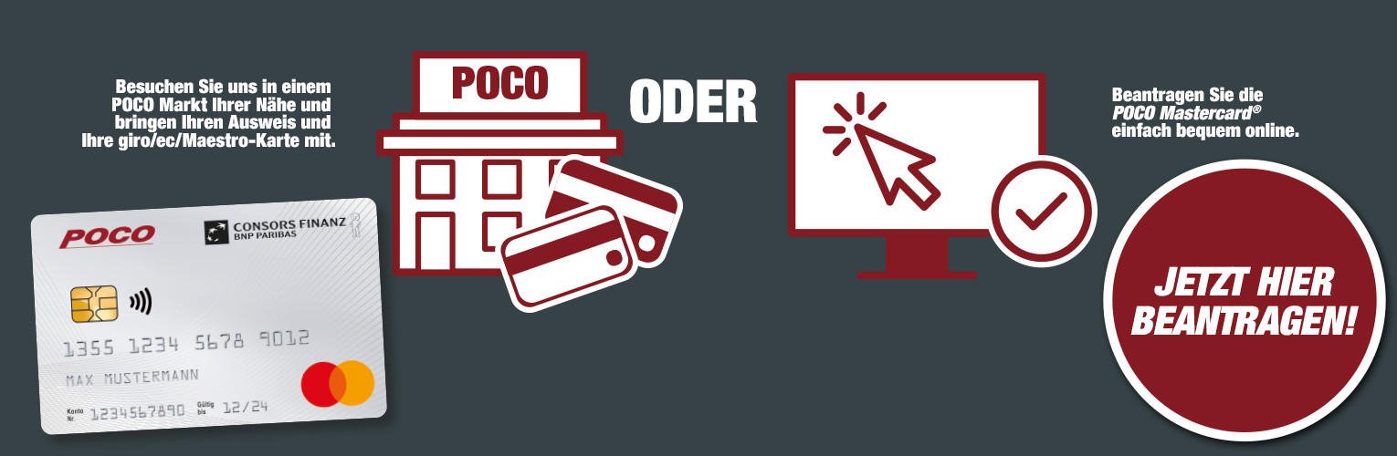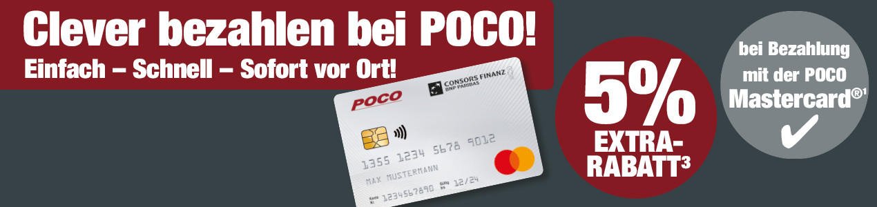 ³ 5% Extra-Rabatt für Folgekäufe und Barabhebungen in Ihrem POCO Markt. Insgesamt max. 100 € pro Kalenderjahr. Gutschrift erfolgt auf dem Konto des Kreditrahmens der POCO Mastercard®, Änderungen bleiben vorbehalten. Nur im stationären Handel.
