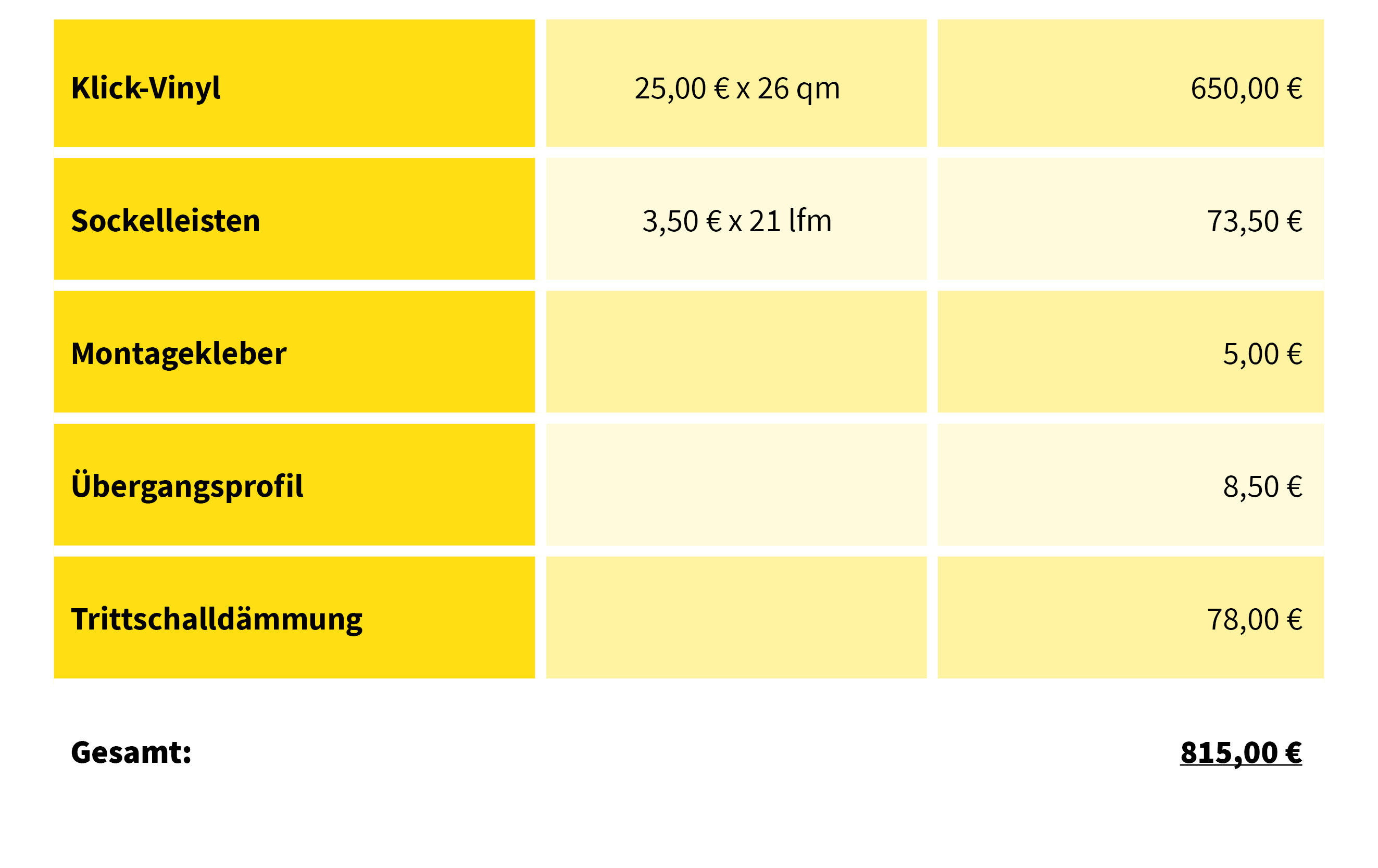 Beispiel: Wir gehen von einem 24-Quadratmeter-Raum mit 6 auf 4 Metern aus, in dem Sie Klick-Vinyl aus Vollvinyl verlegen möchten. Außerdem hat der Raum eine Türöffnung. Als Verschnitt kalkulieren wir beim Bodenbelag mindestens fünf Prozent, bei den Sockelleisten zehn Prozent. Dann ergeben sich bei durchschnittlichen Preisen folgende Kosten: