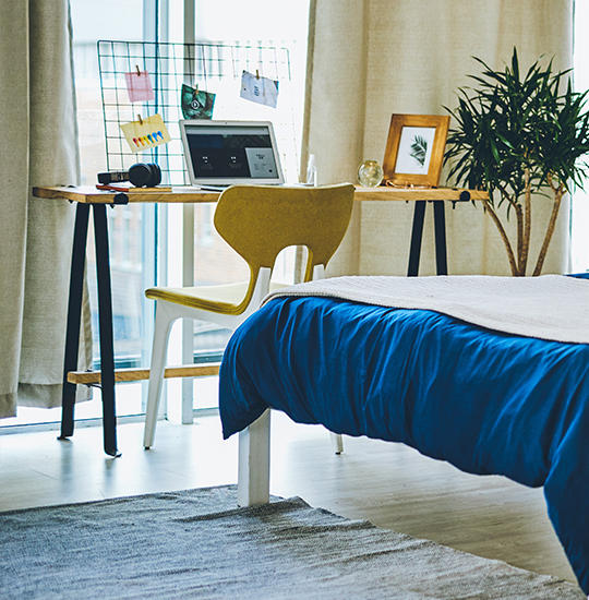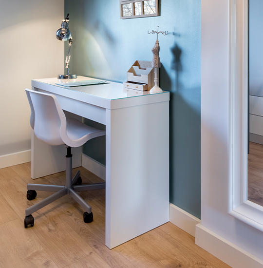 - In kleineren Zimmern ist es denkbar, den Schreibtisch längs an der Wand anzuordnen und beispielsweise hinter Schiebevorhängen zu verstecken.