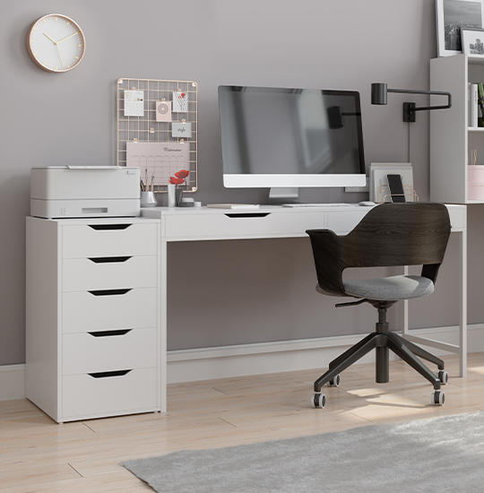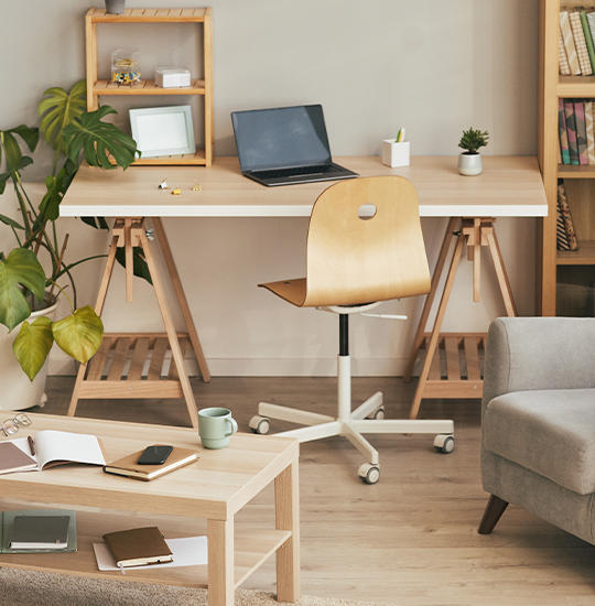 Sie möchten ein Home-Office einrichten, haben aber nur eine kleine Wohnung? Wenn die Fläche knapp ist, nutzen Sie diese bei Bedarf doppelt oder dreifach. Wählen Sie beispielsweise einen Schreibtisch mit integriertem Regal oder kombinieren Sie ihn mit einem Rollcontainer. Steht der Tisch mit einer Seite an der Wand, platzieren Sie dort am besten Hängeregale oder Wandboards.