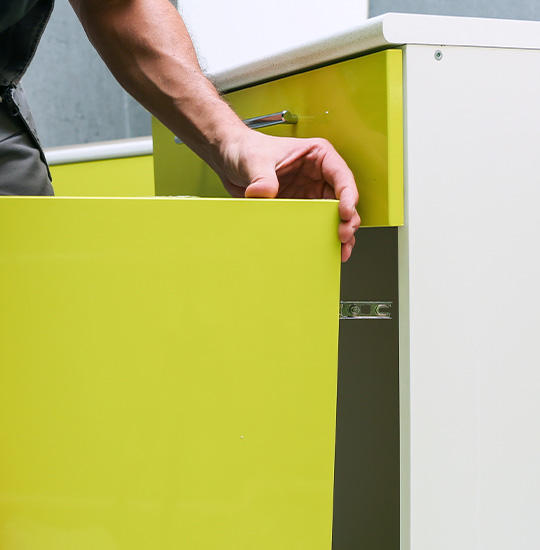Am besten sind Möbel mit glatten Oberflächen geeignet – denn gerade Fronten bekleben Sie kinderleicht in einem Arbeitsschritt. Bei Holzfronten mit kleinen Kanten und geschwungenen Vertiefungen braucht es etwas Geschick. Wer kein geborener Handwerkerkönig ist, entscheidet sich vielleicht alternativ dazu, die Küche zu streichen.