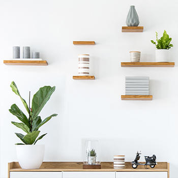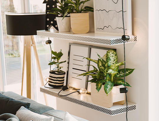 - Laden Sie die Natur ins Regal ein: Pflanzen lockern das Gesamtbild auf und sorgen für ein angenehmes Raumklima. Reservieren Sie wahlweise ganze Fächer, stellen Sie einzelne Pflanzentöpfe vor Ihre Bücher oder arrangieren Sie sie mit passender Deko.