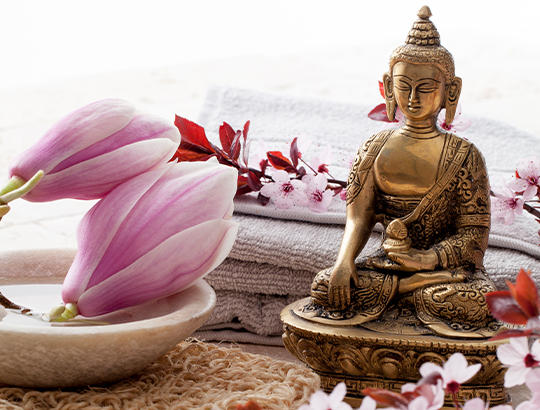 - Asiatische Gelassenheit: Bambuspflanzen, dekorative Steine und eine Buddha-Statue lassen Sie aufatmen und strahlen Ruhe aus.