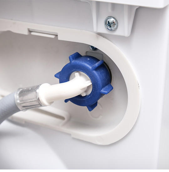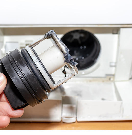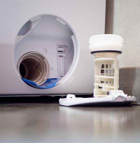 - Flusensieb: Das Flusensieb befindet sich hinter einer Klappe unten an der Vorderseite. Schauen Sie in der Bedienungsanleitung nach, wie diese sich öffnen lässt. Hier gibt es Unterschiede zwischen den Herstellern. Hinter der Klappe ist ein Gummischlauch. Mit diesem lassen Sie Restwasser in eine flache Schüssel ab. Anschließend lösen Sie das Flusensieb nach links und spülen Fussel unter fließendem Wasser ab.