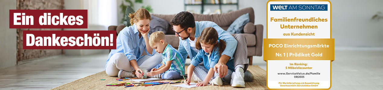 Mithilfe des „Family Experience Score“ (FES), eines speziell entwickelten Indikators, werden die Kundenangaben in jeder Analyse zu einem Mittelwert verdichtet. Dieser gibt dann auf einer Skala von 0 bis 100 die Familienfreundlichkeit an. POCO erhielt einen Score von 65,1 und zeigt damit: Deutschlands größter Möbeldiscounter ist auch Deutschlands familienfreundlichster. Das Siegel „Familienfreundliche Unternehmen“ in Gold ist bis zum August 2026 gültig.