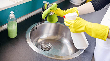 - Für die normale Reinigung reichen Wasser, ein Schwamm sowie ein Spritzer Spülmittel. Wenn Sie die Spüle regelmäßig nach jedem Gebrauch abwischen, beugen Sie hartnäckigen Verschmutzungen vor.