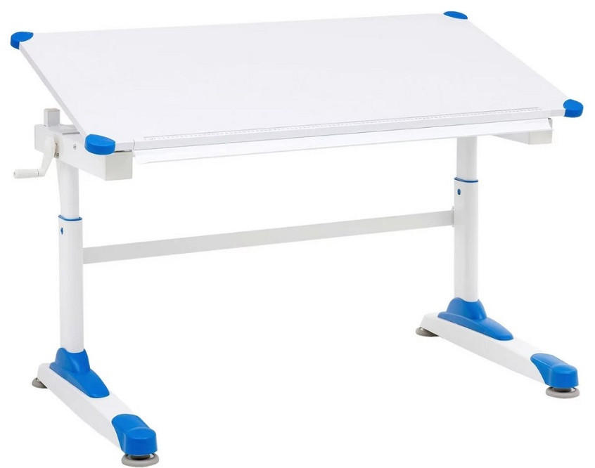 Kinderschreibtische können ebenfalls höhenverstellbar sein. Damit sind jedoch nicht die auf erwachsene Benutzer ausgerichteten elektrisch verstellbaren Modelle gemeint, die zur Arbeit im Stehen ermuntern. Kinderschreibtische sind lediglich darauf ausgerichtet, einige Jahre von der Grundschule bis zur weiterführenden Schule mit Ihrem Kind mitzuwachsen. Die Höhe passen Sie ein- bis zweimal pro Jahr mithilfe einer Kurbel an. Vollständig hochgefahren entsprechen sie dann den Maßen eines Schreibtischs für Erwachsene. Eine weitere Besonderheit dieser Möbelstücke ist die klappbare Tischplatte. Sie lässt sich schräg hochklappen, damit sie für Zeichen- und Malarbeiten in ergonomisch gesünderer Haltung genutzt werden kann.
