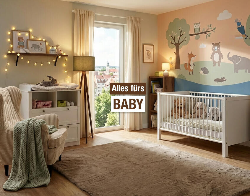 Erwarten Sie Nachwuchs? Vielleicht sogar zum ersten Mal? Wir haben die passenden Produkte für Ihren kleinen Liebling. In unserer Themenwelt „Alles fürs Baby“ stellen wir Ihnen ein komplettes Babyzimmer mit allen Möbeln, die man für das Einrichten eines Babyzimmers benötigt, vor.