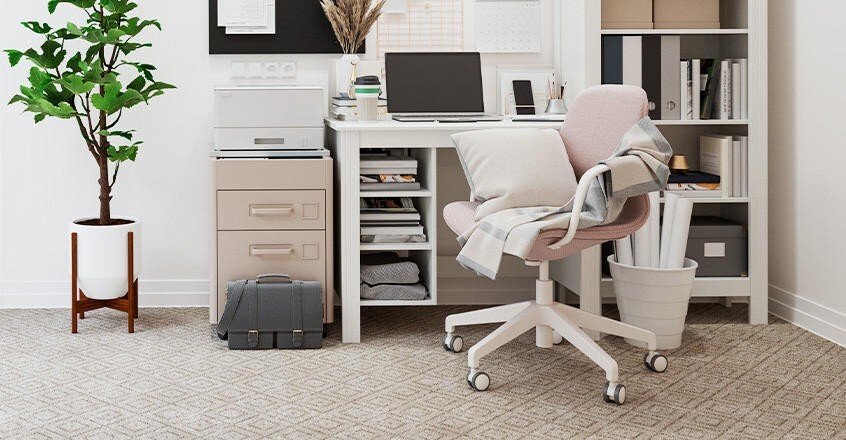 Teppichfliesen: Im Büro dämpft der textile Bodenbelag Geräusche. Das ist angenehm, wenn Sie zu zweit im Homeoffice arbeiten. Ausführungen aus Nadelfilz sind extrem robust. Zudem lassen sich selbstklebende und selbstliegende Teppichfliesen einfach und schnell verlegen.