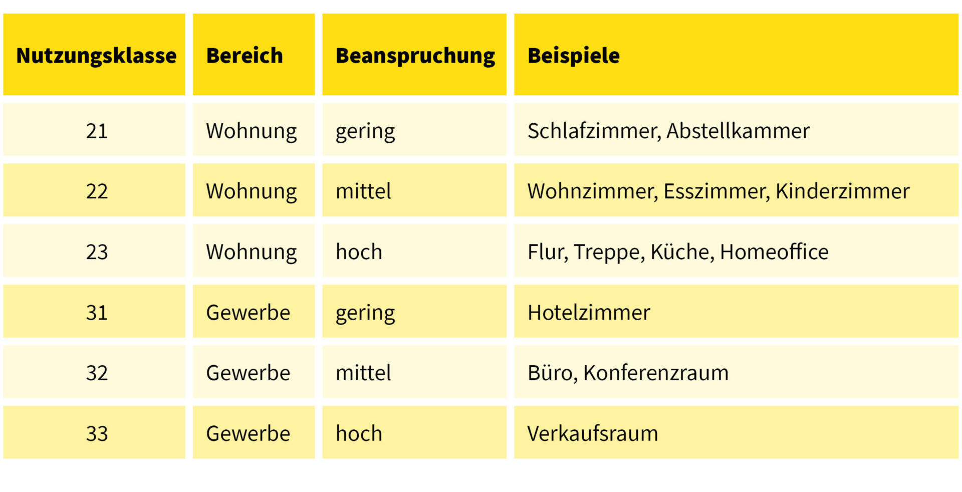 Die zweite Ziffer zeigt die genaue Höhe der möglichen Beanspruchung. 1 steht für mäßige, 2 für mittlere und 3 für eine starke Beanspruchung. Was bedeutet das? Ausschlaggebend ist vor allem, wie häufig jemand über den Boden geht. Im Flur oder im Wohnzimmer sind die Anforderungen höher als im Schlafzimmer.
