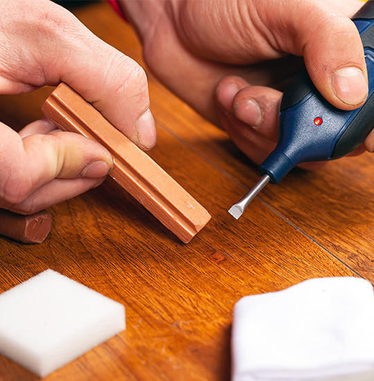 Tiefe Kratzer, Abplatzungen und Löcher lassen sich ebenfalls beseitigen: Um sie aufzufüllen, eignet sich Reparaturwachs für Holzböden. Wenn Sie Laminat reparieren, haben Sie die Wahl zwischen Hartwachs und Weichwachs: