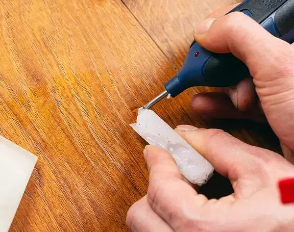 - Hartwachs halten Sie an einen kleinen, batteriebetriebenen Schmelzer. Mit den Tropfen lassen sich dann die Defekte im Parkett ausbessern. Wenn das Wachs langsam fest wird, ziehen Sie die Oberfläche mit einem kleinen Spachtel glatt.