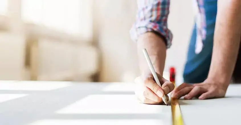 - Schritt 4 – Endstück kürzen: Um das Endstück schnell und präzise zu kürzen, legen Sie es umgedreht an der Wand an. Dehnungsfuge zur Wand nicht vergessen! Zeichnen Sie den Schnitt mit dem Bleistift an und kürzen Sie das Element mit der Stichsäge. Je nach Klicksystem benötigen Sie ein Zugeisen, um das letzte Element festzuklopfen.