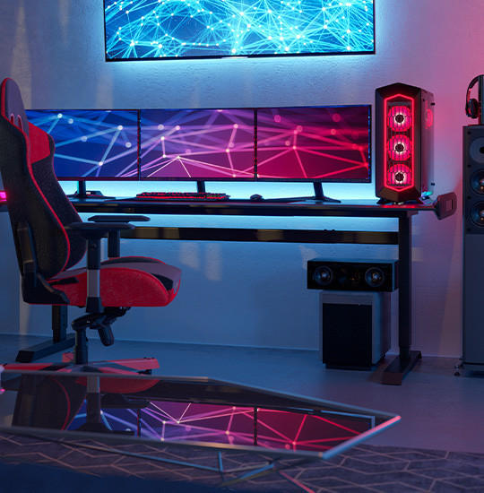 Für PC-Spieler gibt es im Gaming Room ein Möbel, das absolut unverzichtbar ist: ein Tisch für die „Kommandozentrale“. Der wichtigste Punkt ist hier die Größe – und diese hängt von Ihrem Monitor-Set-up ab. Haben Sie einen, zwei oder drei Screens? Entsprechend breit sollte im Gaming-Zimmer der Schreibtisch sein. Sofern es der Platz erlaubt, planen Sie aber am besten eine zukünftige Erweiterung ein. Apropos Platz: Erfahren Sie, wie Sie das Beste aus einem kleinen Gaming Room herausholen.