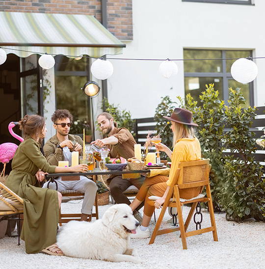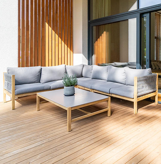 Gestalten Sie eine gemütliche Sitzecke, die bei schönem Wetter zum Relaxen einlädt. Dafür bietet sich nicht nur der Platz direkt hinter dem Haus an – ein Outdoor-Wohnzimmer kommt im Reihenhausgarten auch toll an der hinteren Grundstücksgrenze zur Geltung.