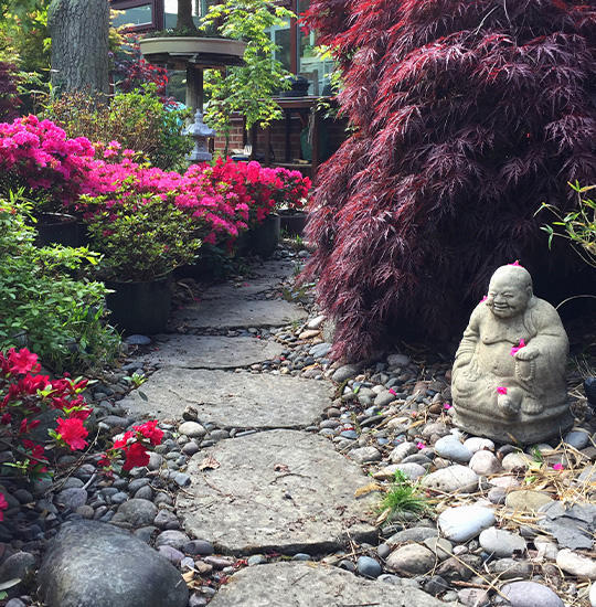 - Statuen wie Steinlaternen und Buddhafiguren untermalen die Gartengestaltung und setzen optische Highlights inmitten der grünen Umgebung.