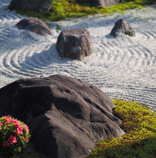 Eine Sonderform unter den Japangärten stellt der Zengarten dar, der im Wesentlichen einem Steingarten entspricht: Größere Pflanzen, weitläufige Rasenflächen und Wasser tauchen an diesem Ort nicht auf. Vielmehr beherrschen Kies, Sand, Feldsteine und Felsbrocken das Landschaftsbild – daher kommt auch die Bezeichnung Trockengarten. Wellenförmige Muster im Kies symbolisieren natürliche Wasserläufe und Steine dazwischen stehen für Inseln. Mit einem Rechen zeichnen Sie die Linien schwungvoll durch den Boden – das ist eine äußerst entspannende Art der Gartenarbeit mit meditativer Wirkung, die Ihnen wahrscheinlich bekannt vorkommt. Denn Zengärten gibt es schon länger im Miniaturformat für den Schreibtisch.