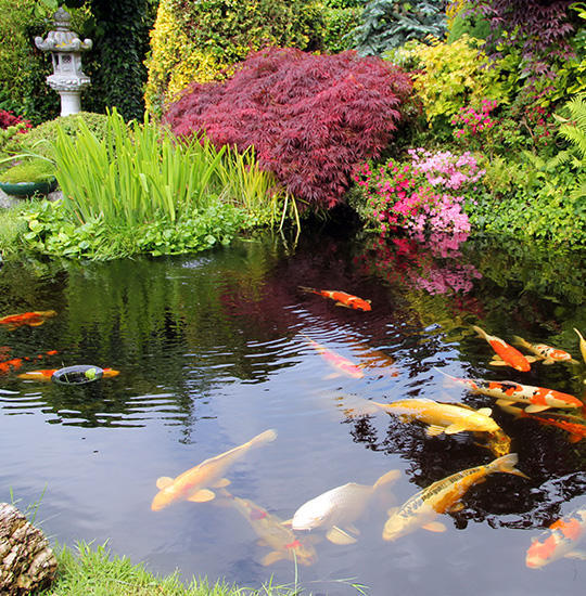 - Ein Teich mit Koikarpfen spiegelt die japanische Gartenkunst in Perfektion wider. Wählen Sie geschwungene Formen statt eines rechteckigen Beckens. Denken Sie außerdem an einen Sitzplatz am Wasser, von dem aus Sie das natürliche Treiben im Wasser beobachten können.