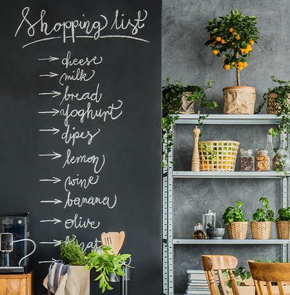 - Malen Sie sich mit Tafelfarbe eine beschreibbare To-do-Liste an die Wand – darauf notieren Sie Einkaufsliste und Termine gut sichtbar für alle Bewohner.