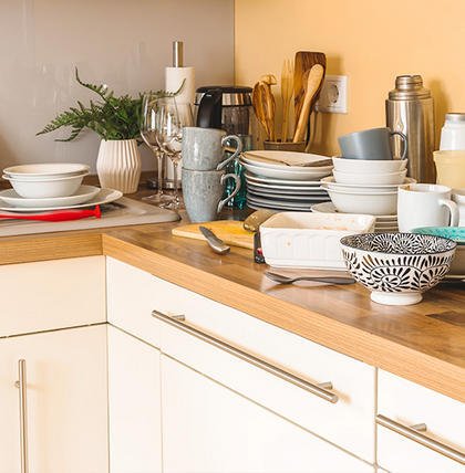 - Unordnung auf der Arbeitsplatte ist von der Couch aus sichtbar.