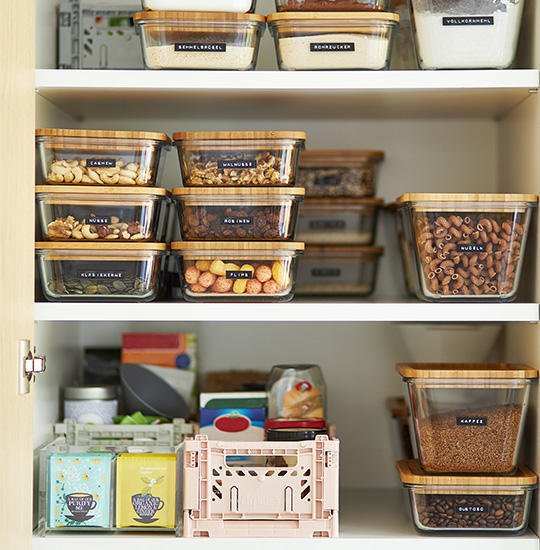 - Prüfen Sie das Ablaufdatum Ihrer Lebensmittel und misten Sie den Vorratsschrank aus. Füllen Sie lose Zutaten wie Mehl und Zucker dabei gleich noch in Vorratsdosen um. Übereinandergestapelt brauchen die Aufbewahrungsdosen weniger Platz, als wenn sich kreuz und quer Tüten und Verpackungen im Schrank sammeln.