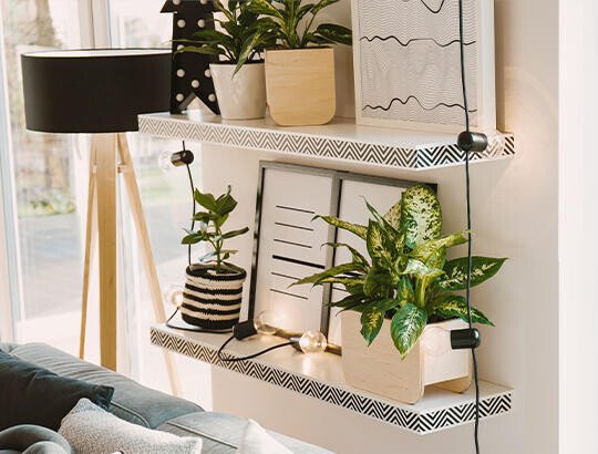 - Laden Sie die Natur ins Regal ein: Pflanzen lockern das Gesamtbild auf und sorgen für ein angenehmes Raumklima. Reservieren Sie wahlweise ganze Fächer, stellen Sie einzelne Pflanzentöpfe vor Ihre Bücher oder arrangieren Sie sie mit passender Deko.
