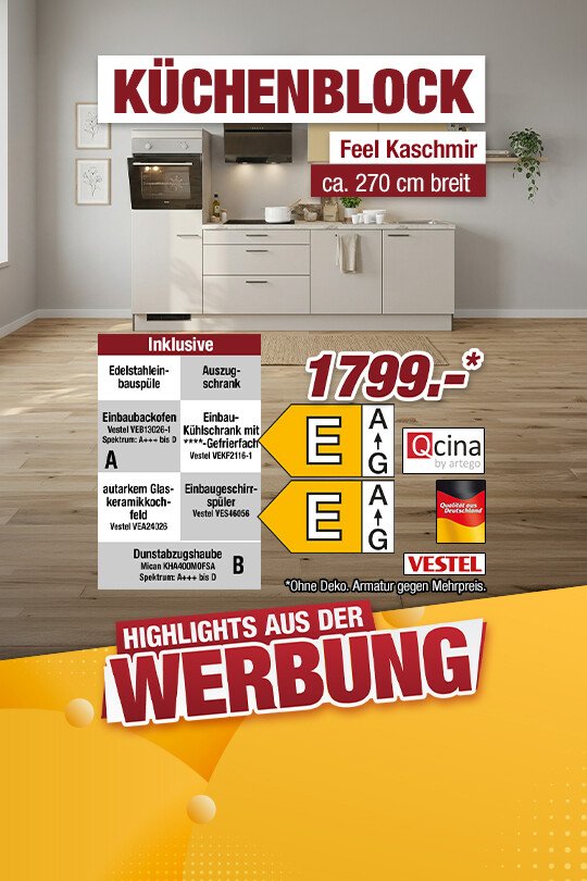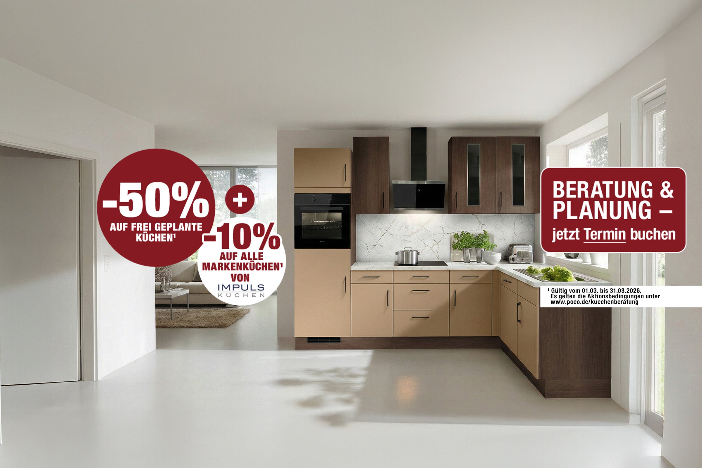Bei POCO finden Sie Küchen für verschiedene Anforderungen. Eine vormontierte Mitnahmeküche ist schnell aufgebaut, alternativ können Sie Ihre Küche individuell zusammenstellen.