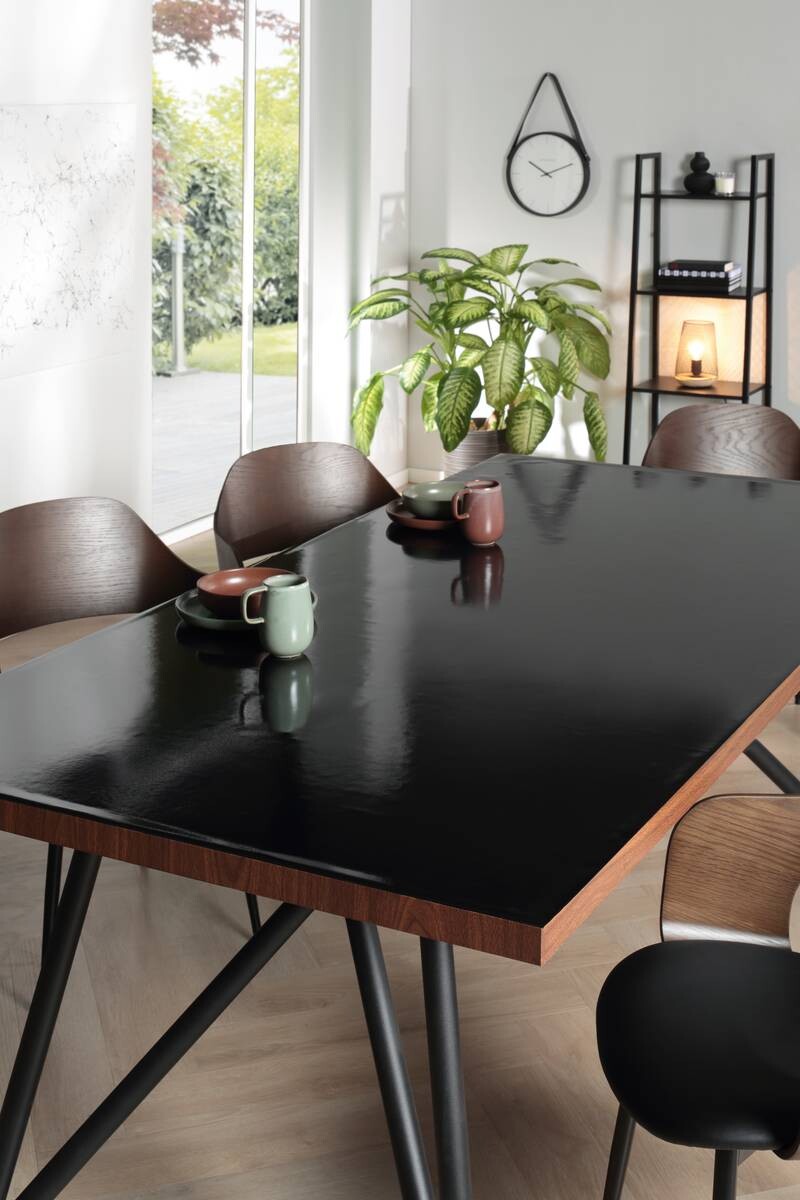 Die abwischbare schwarze Tischfolie passt sich der Tischform bequem an.