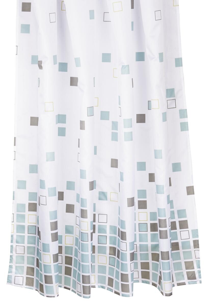 Der weiße Textil Duschvorhang, mit blauem Muster, aus 100% Polyester ist ca. 180 x 200 cm groß.