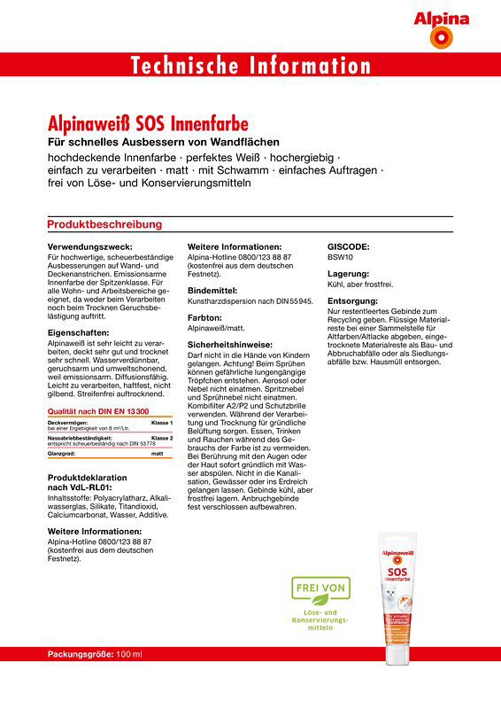 Holen Sie sich das perfekte Weiß jetzt auch als praktische Tube zum Ausbessern von kleineren und größeren Flecken nach Hause. Alpinaweiß überzeugt durch starke Deckkraft, geprüfte Inhaltsstoffe und ein perfektes Endergebnis. Mit der handlichen Tube können Ausbesserungsarbeiten auf der Wand schnell und einfach vorgenommen werden. Der integrierte Schwammaufsatz ermöglicht das Ausbessern im Handumdrehen und verhindert Streifenbildung oder Pinselstriche. Das strahlende Weiß entfaltet sofort eine Wirkung, wie Sie sie vom reinsten Schneeweiß der Alpen kennen.