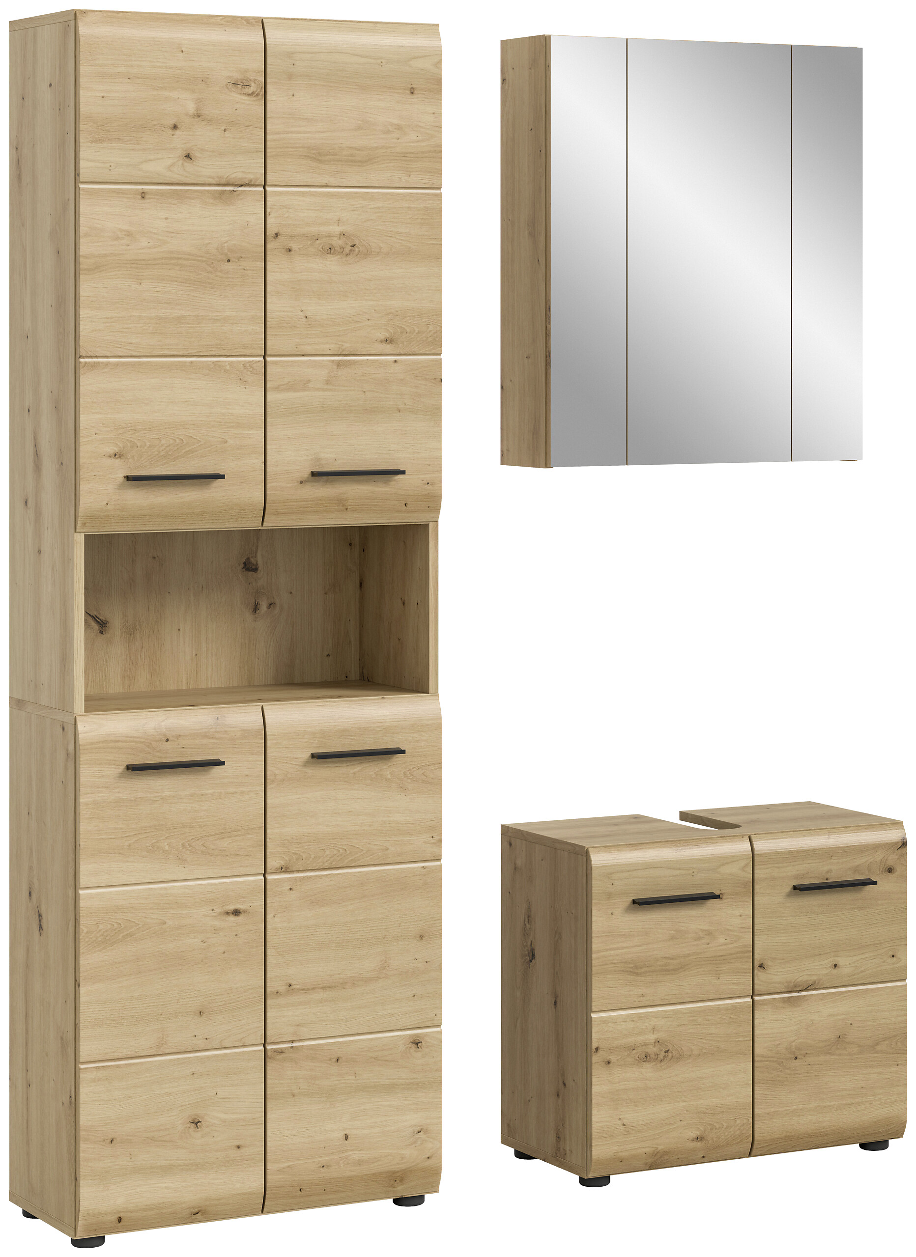 Badkombination (135x185x30 cm) – 3-teilig Elegant und funktional: Diese 3-teilige Badkombination besteht aus Hochschrank, Waschbeckenunterschrank und Spiegelschrank – perfekt für mittelgroße Badezimmer. Die Holzfarbe in Artisan Oak Nachbildung schafft ein edles Ambiente mit viel Stauraum.