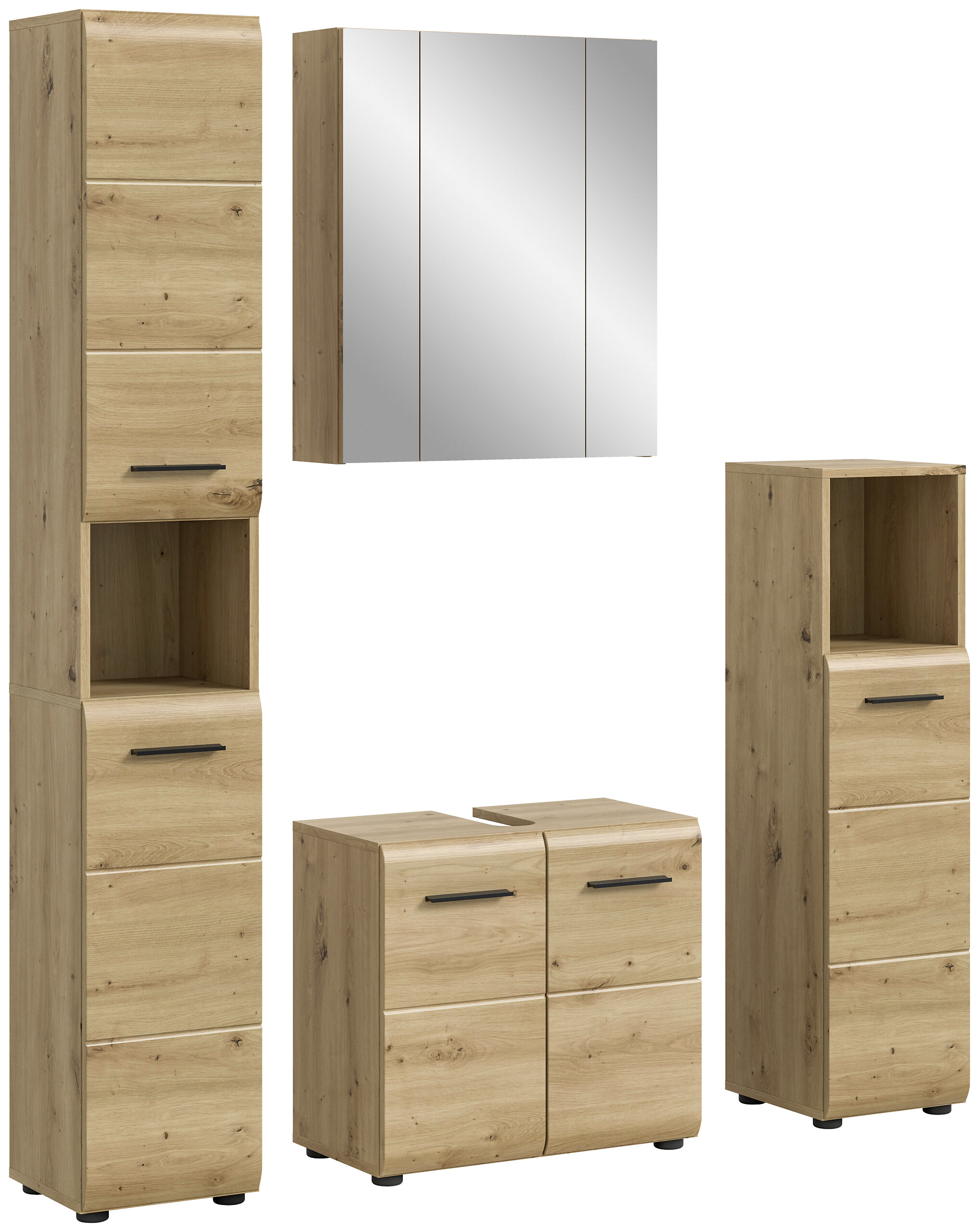 Badkombination (B/H/T: 150x185x30 cm) – 4-teilig, Artisan Oak Nachbildung Diese Kombination punktet mit einem Hochschrank, Spiegelschrank, Waschbeckenunterschrank und einem hohen Standschrank – alles in einem stimmigen, modernen Look. Die Kombination aus Schwarz und Holz sorgt für ein edles Raumgefühl und schafft Ordnung mit Stil.