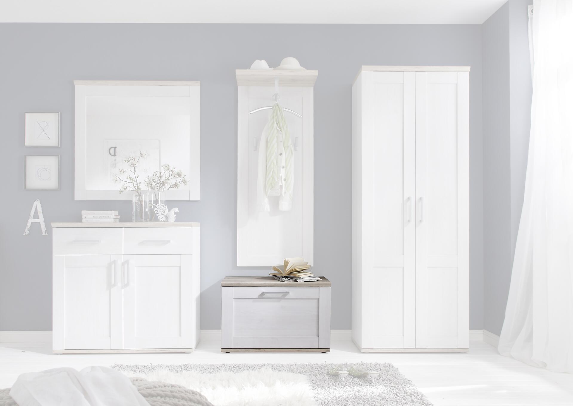 Elegant verspielte Garderobe in Landhausoptik mit nordisch stilistischen Akzenten. Farblich in Sibiu-Lärche mit Absetzungen in San Remo hell Nachbildung gehalten, verleiht sie dem Landhausstil eine neue geschmackvolle Facette.