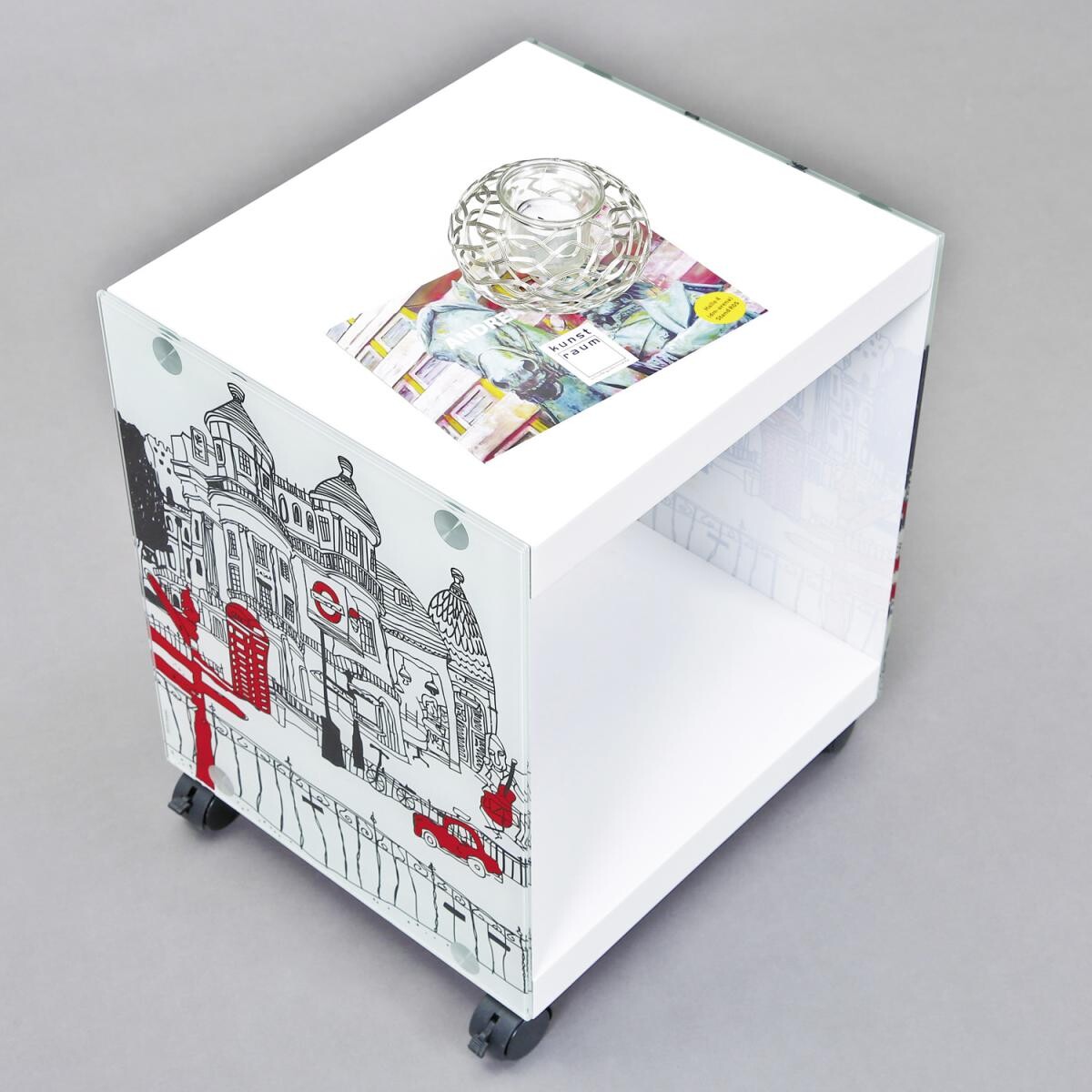 Praktischer Beistelltisch mit 4 Rollen. Aus robuster MDFPlatte und Sicherheitsglas mit modernem Motiv. Ein tolles Accessoire für Ihre Wohnung und individuell einsetzbar, immer dort wo er gerade gebraucht wird.