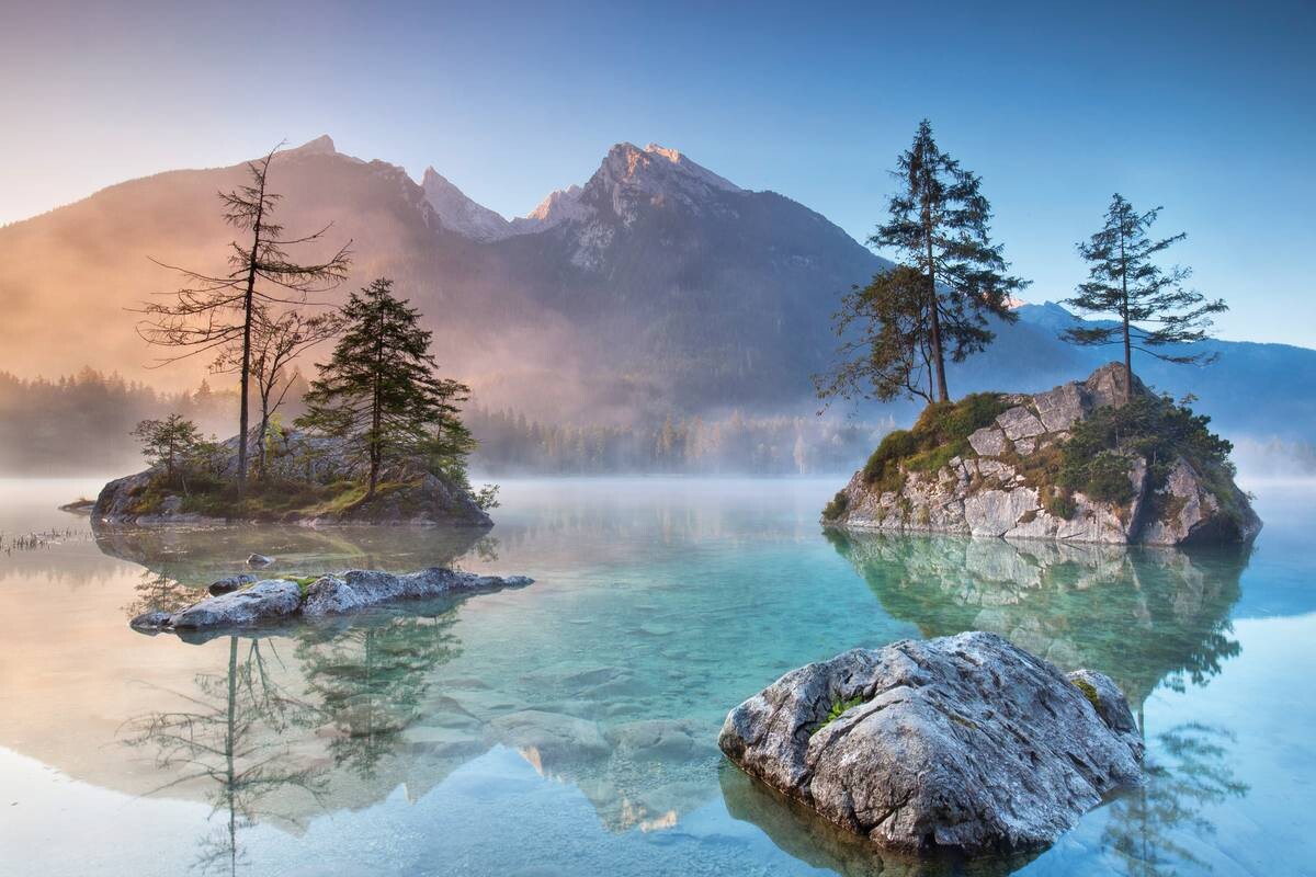 Dieses Keilrahmenbild misst ca. 60 x 90 cm und zeigt ein stimmungsvolles Motiv eines Bergsees. Perfekt, um Ihrem Zuhause eine friedliche und naturnahe Atmosphäre zu verleihen.