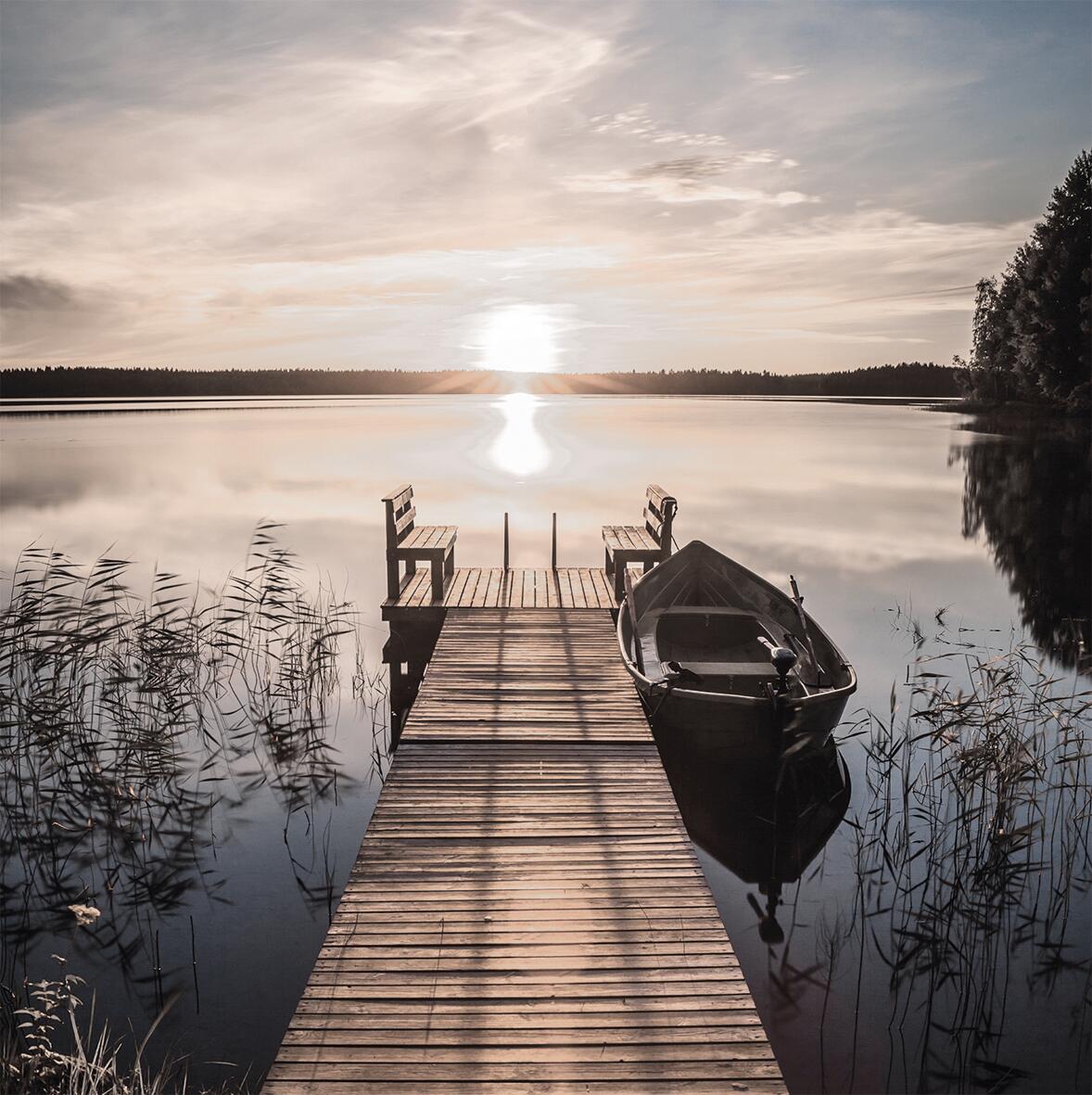 Dieses Keilrahmenbild misst ca. 35 x 35 cm und zeigt einen idyllischen Steg, der ins Wasser führt - ein Symbol für Ruhe und Entspannung. Das stimmungsvolle Motiv bringt eine friedlichen Atmosphäre in jeden Raum und lädt zum Träumen und Abschalten ein.