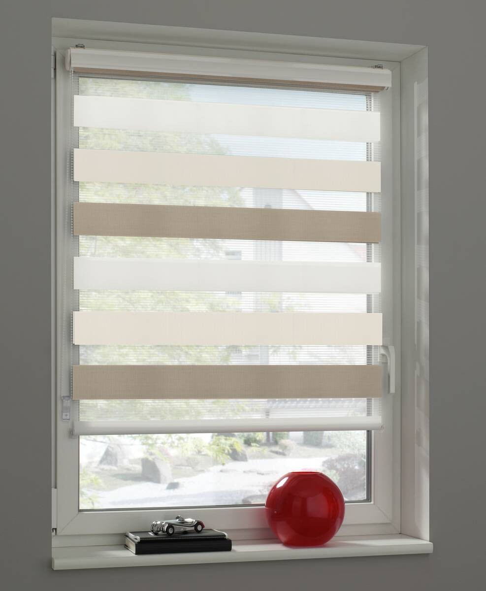 Dieses moderne Doppelrollo mit Blende in der Größe 100 x 160 cm, bietet Ihnen einen perfekten Sichtschutz. Durch seine abwechselnd transparenten (Höhe 5 cm) und blickdichten (Höhe ca. 7,5 cm) Streifen, regulieren Sie individuell den Lichteinfall und den Sichtschutz. Blende und Unterprofil sind in weiß gehalten. Das Kettenzuggetriebe ist rechts montiert.