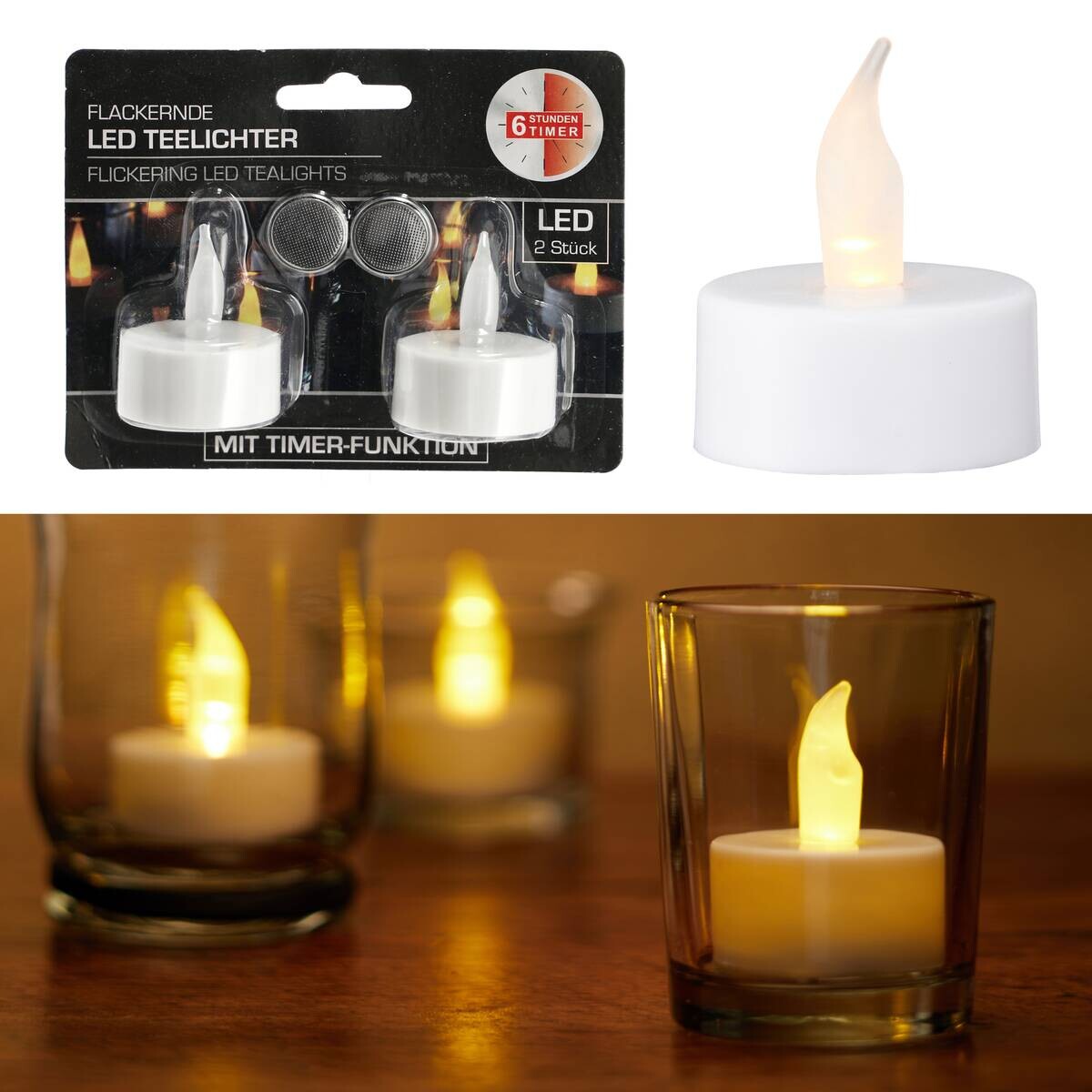 Dieses 2er-Set LED-Teelichter in Weiß sorgt für gemütliche Atmosphäre – sicher, sauber und praktisch. Mit integriertem 6-Stunden-Timer und jeweils einer CR2032-Knopfzelle ausgestattet, sind sie sofort einsatzbereit und perfekt für jeden Wohnbereich.