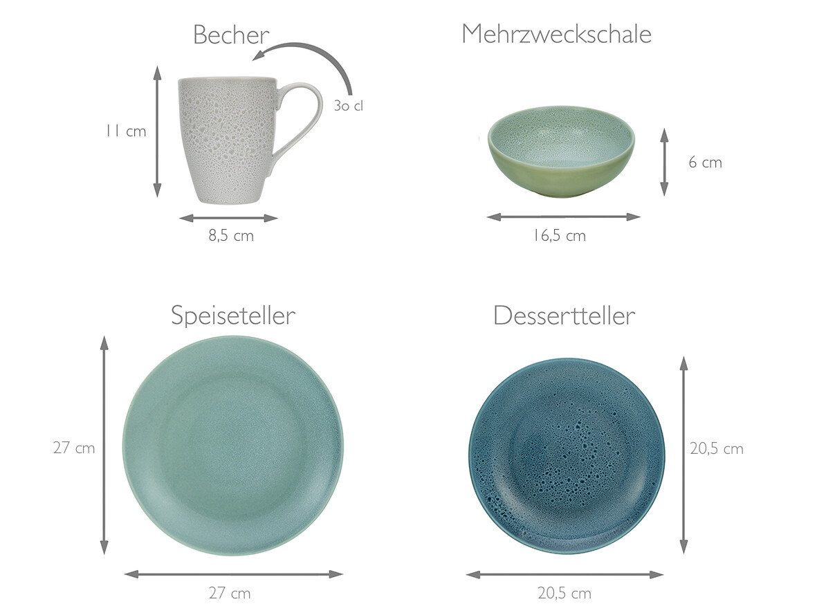 Das Geschirr präsentiert sich mit einer nostalgischen Spezialglasur, bei der die Außen- und Innenseiten beim Brand reaktiv reagieren. Dadurch entstehen schöne Farbverläufe in den 4 nordischen Farben Blau, Grün, Türkis und Mint. Zusätzlich entsteht auf den Innenflächen und auf der Becher Außenseite ein zusätzlicher Weiß Effekt als Hintergrundfarbe. „Reactive Nordic“: Jedes Teil ein Unikat! Spülmaschinen- und mikrowellengeeignet.