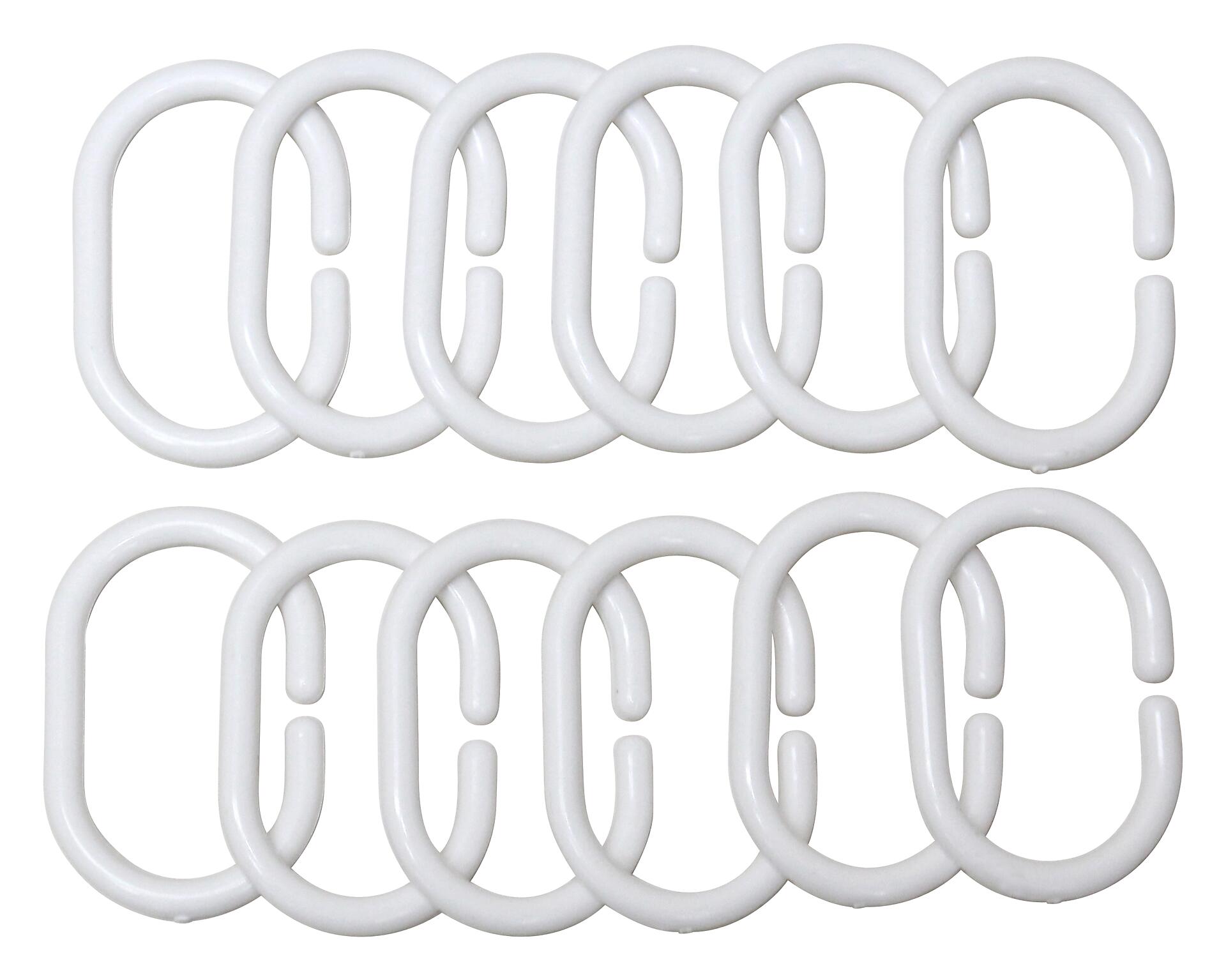 Die weißen Duschringe aus Kunststoff sind im 12er-Pack erhältlich. Sie sind passend für alle gängigen Duschvorhänge und Duschstangen.