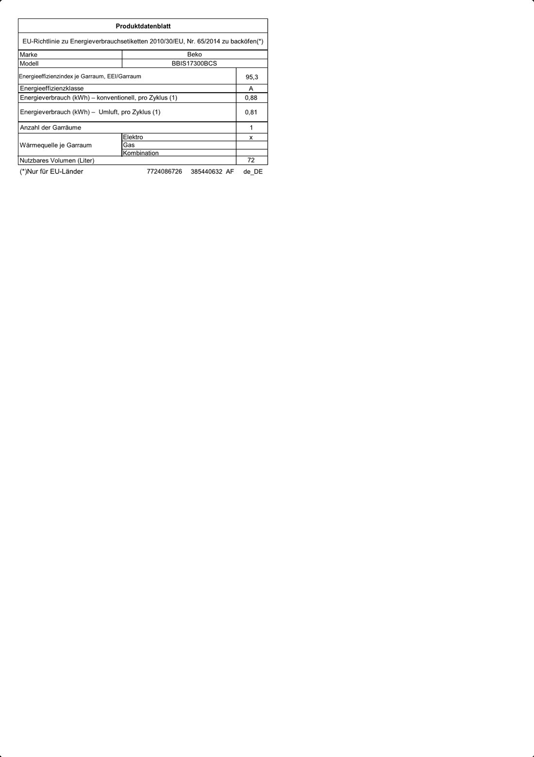 - Einbaubackofen Energieeffizienzklasse A Beko BBIS17300BCS
