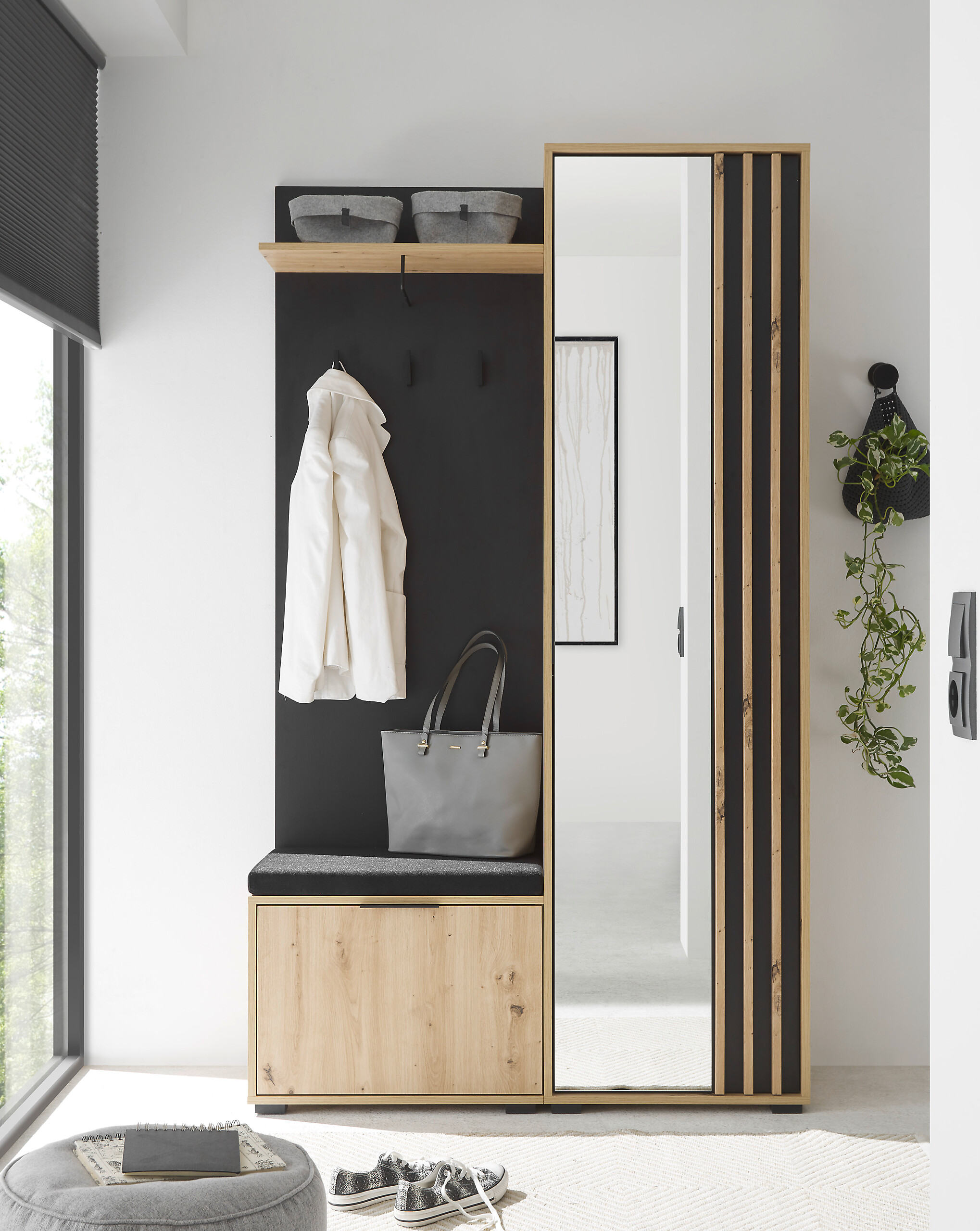 Auf kleinem Raum bietet diese Garderobe viel Stauraum: