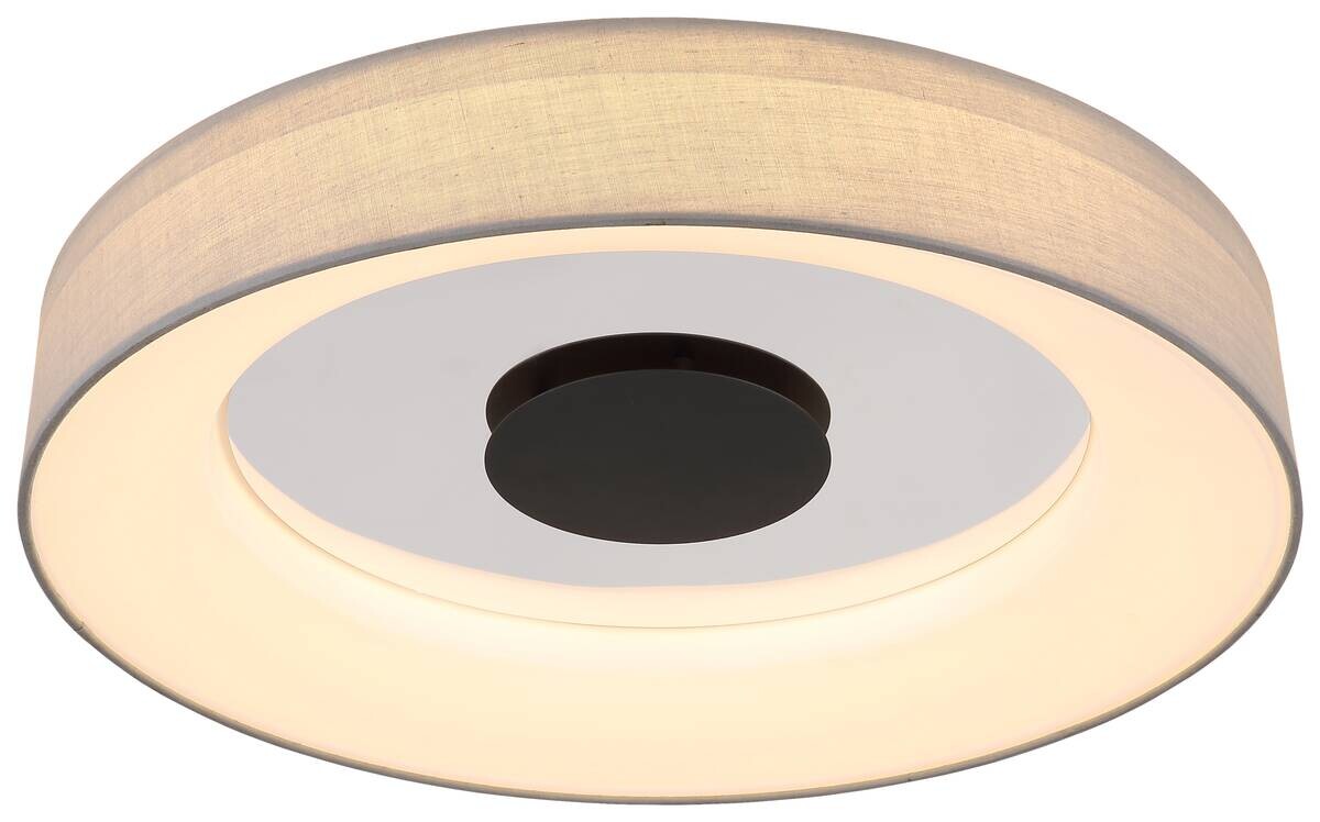 Deckenleuchte Metall weiß matt, Metall schwarz matt, Textil grau, Kunststoff opal, Acryl verchromt, dimmbar, Farben fixierbar, Bluetooth, Memoryfunktion, Nachtlicht, Fernbedienung, Lautsprecher 5W, Batterie inkludiert 2x AAA, ø: 468mm, H: 98mm, inkl. LED 40W 230V, 800-4500lm Source, 350-2000lm Output, CCT 2700-6500K