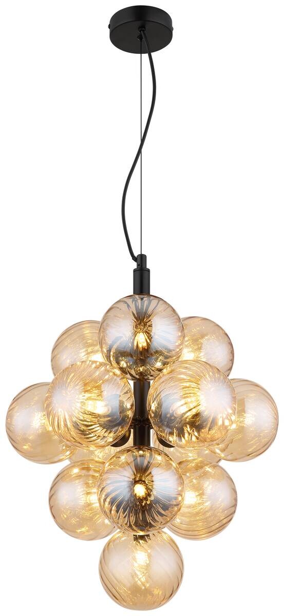 Die Hängeleuchte CONOR mit 13 amberfarbenen Glaskugeln und schwarzem, mattem Metallkorpus sorgt für eine beeindruckende Beleuchtungslösung. Geeignet für G9 LED-Leuchtmittel (exklusive).