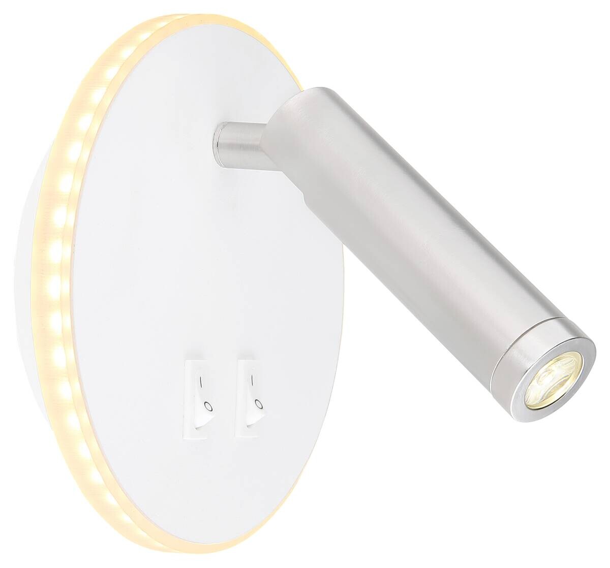 Diese moderne Wandlampe aus der Many-Serie (ø 14,6 cm) fügt sich dank ihres schlichten Designs aus weißem Metall wunderbar ins Ambiente verschiedenster Wohnstile. Die mit 15 cm von der Wand ragende Leuchte besteht aus einer runden Metallplatte, der von einem opalenem Acrylring mit LED-Leuchtmittel umrahmt wird. Zudem verfügt sie über einen schräg nach unten gerichteten, nickel-matten Metallzylinder, der an der Unterseite ebenfalls mit LEDs versehen ist. Die inkludierten LED-Leuchtmittel leisten dabei 489 Lumen starkes Licht bei einer angenehmen Lichtfarbe von 3000 Kelvin (warmweiß) und können mit den integrierten Schaltern separat ein- und ausgeschaltet werden. Durch weitere Artikel der gleichen Serie können Sie das Gesamtbild in Ihren Innenräumen komplettieren.