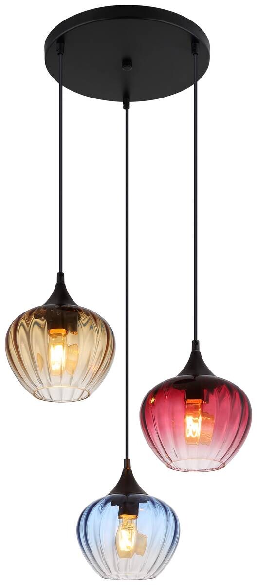 Die Pendelleuchte SANDER aus schwarz mattem Metall besticht durch ihre einzigartige Gestaltung. Die Gläser in blau, rot und amber verlaufend auf klar sorgen für ein faszinierendes Lichtspiel und schaffen eine besondere Atmosphäre im Raum. Die Gläser sind zudem mit Rillen versehen, die das Licht effektvoll brechen und für ein harmonisches Ambiente sorgen. Das schwarze PVC Kabel rundet das Design der Pendelleuchte SANDER ab und verleiht ihr einen modernen Look. Diese Leuchte ist ein echter Blickfang und eignet sich perfekt für Wohnräume, Esszimmer oder auch Restaurants und Bars. Mit SANDER holen Sie sich ein Stück zeitlose Eleganz und stimmungsvolles Licht in Ihr Zuhause.