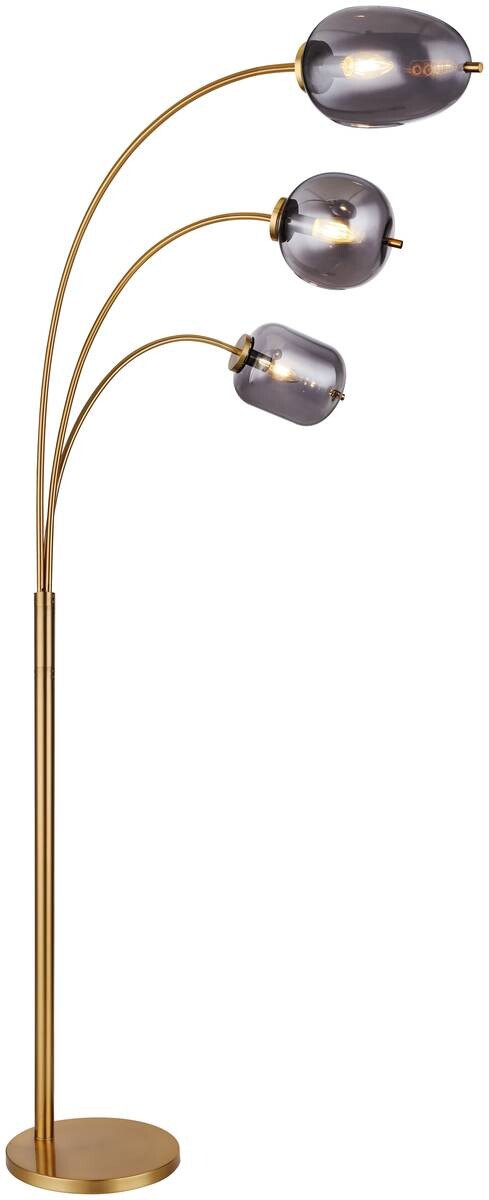 Stehleuchte Metall messingfarben matt, Glas rauchfarben, Fußtrittschalter im Kabel, 3 unterschiedliche Gläser, LxBxH: 800x600x1750mm, Kabellänge 1800mm, exkl. 3x E14 40W 230V